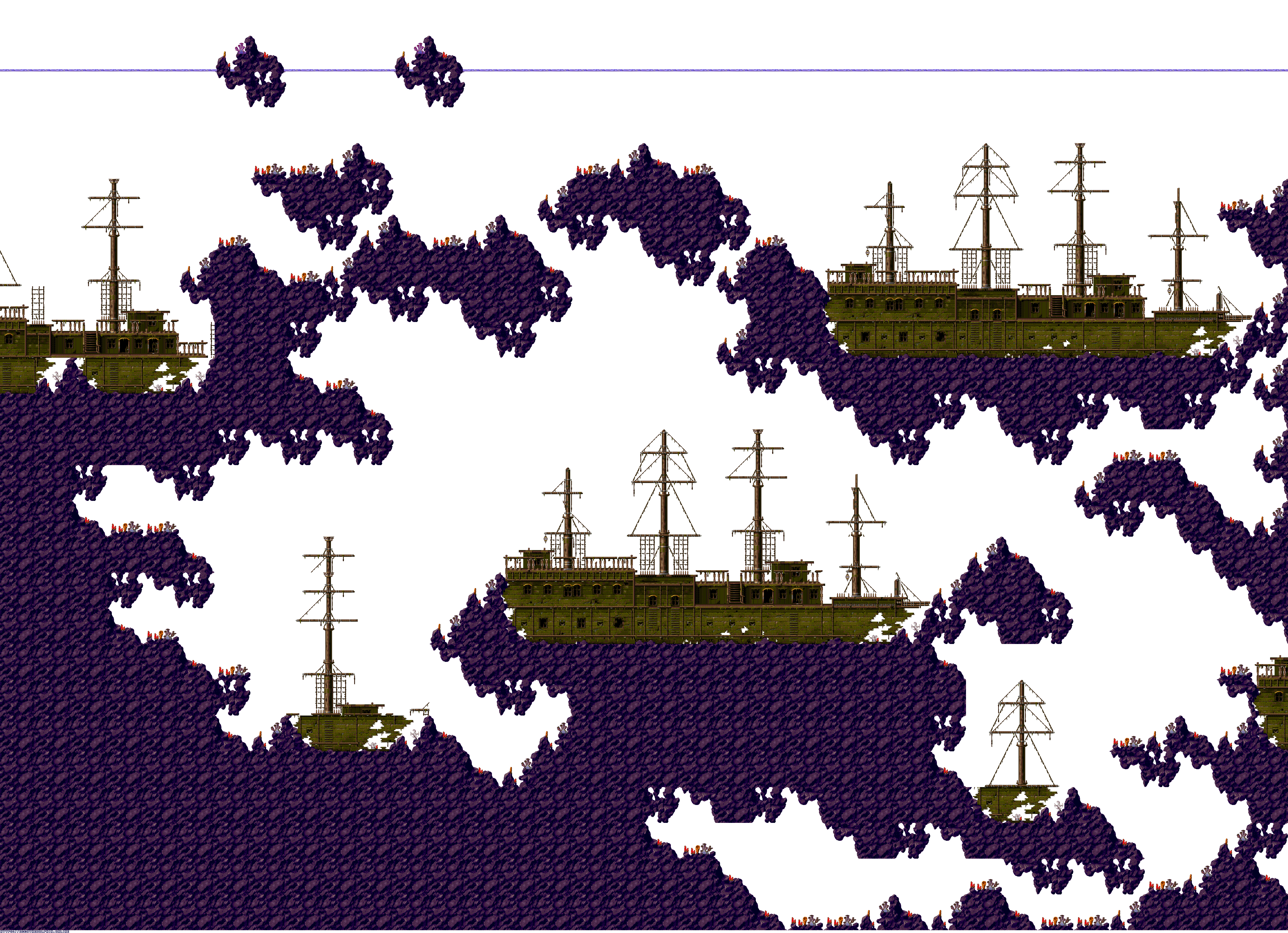 A collection of level maps from Ecco the Dolphin PC. This version of the game is unique for its high resolution mode. For that mode the overall graphics were doubled in size and partially redrawn. There is no parallax effect for backgrounds while in high resolution mode. Instead newer backgrounds were created to fit the size of the stage.