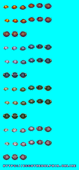 A collection of sprite sheets from Ecco the Dolphin for the Sega Genesis/Mega Drive. These sprite sheets were extracted from the game itself using tools created from our reverse engineering efforts. The tools are capable of decoding and reading Mega Drive bitmaps, and various Ecco the Dolphin sprite and level formats. Our sprite sheets are free to distribute as long as credit is given to https://eccoonline.net