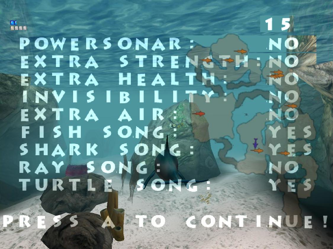 Pressing X while in the main Options menu displays a message "Cheats Enabled" in the bottom right corner. Whilst not giving Ecco invincibility or endless air it does unlock all the Songs and Powers. On some of the levels it automatically triggers key points that would normally require solving the level’s main puzzle first, like opening the temple door at Shrine of Controversy.