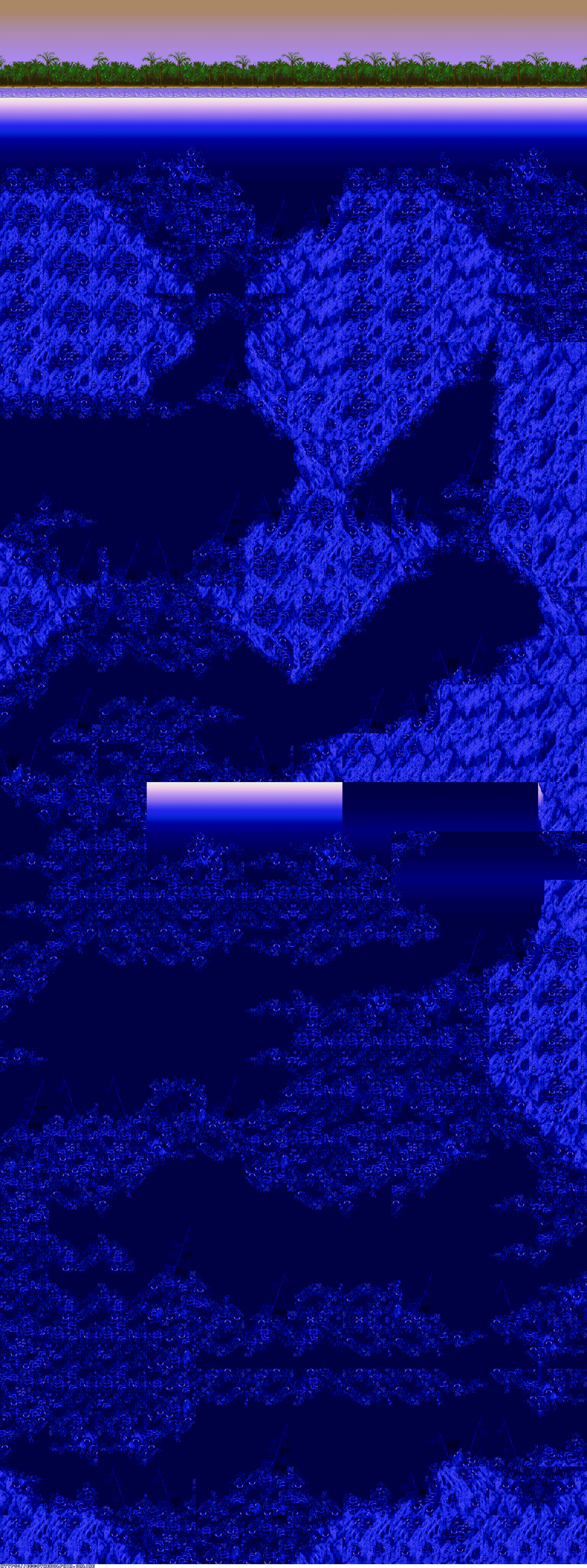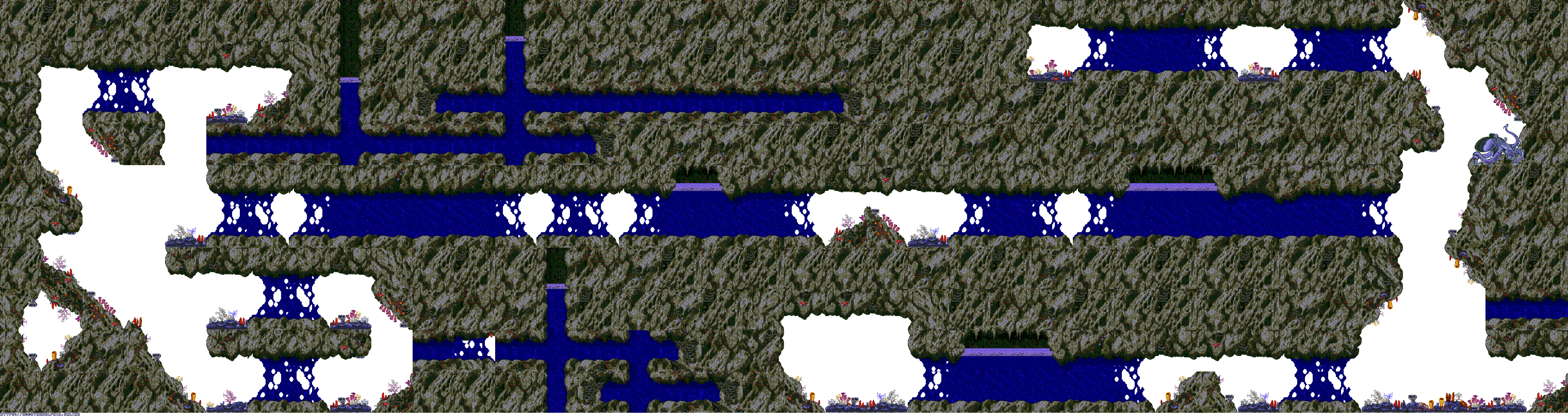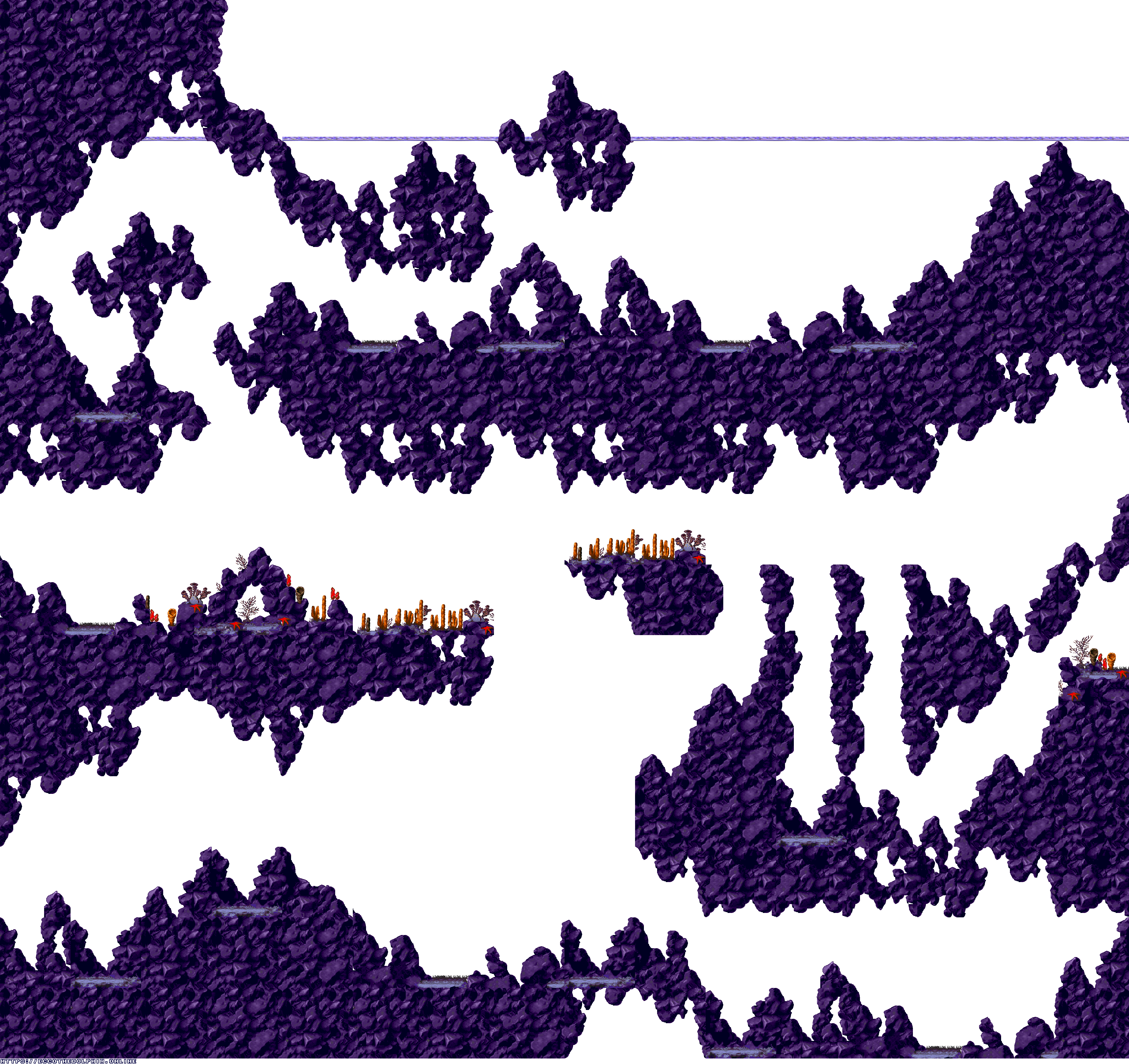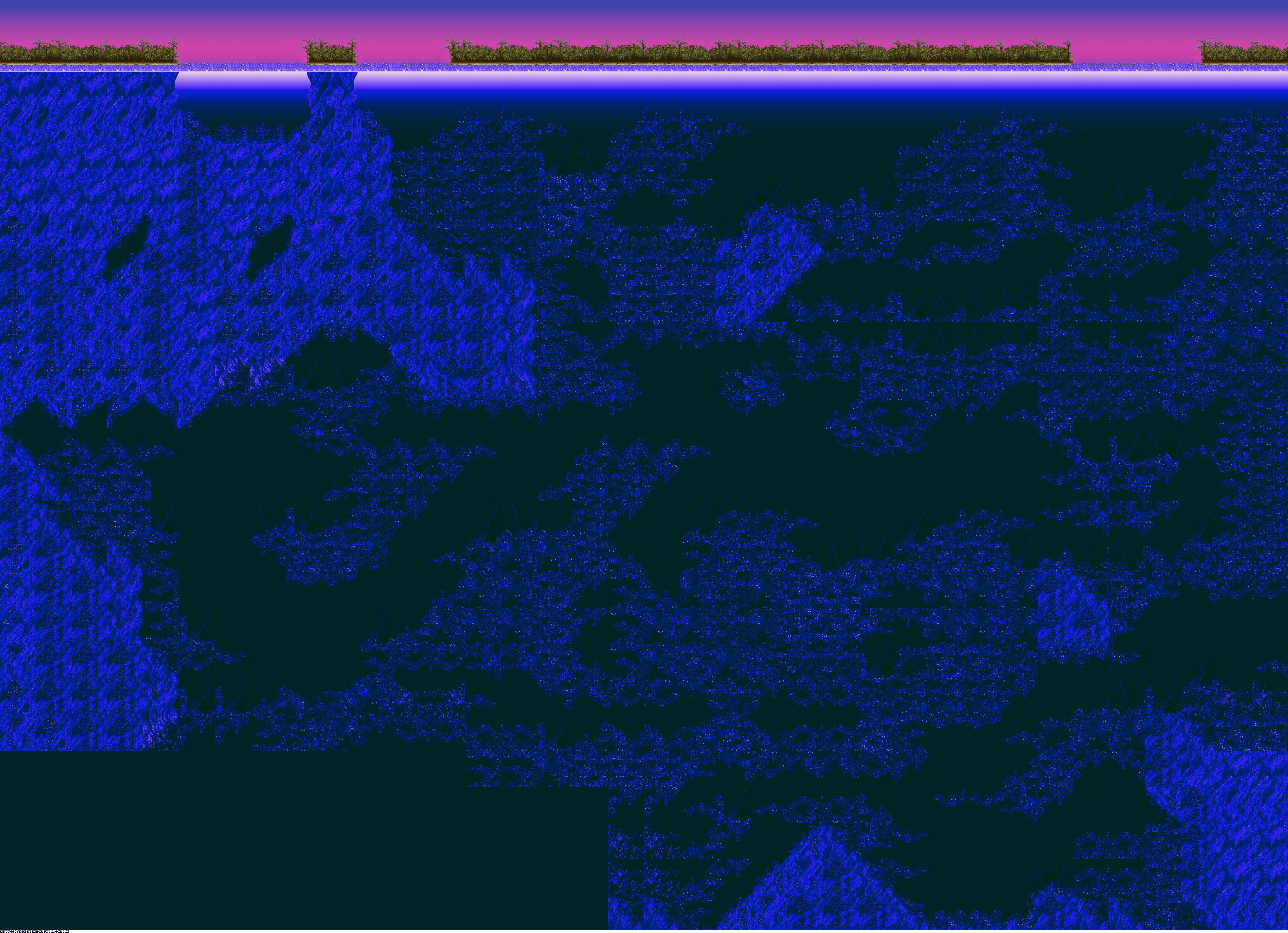 A collection of level maps from Ecco the Dolphin PC. This version of the game is unique for its high resolution mode. For that mode the overall graphics were doubled in size and partially redrawn. There is no parallax effect for backgrounds while in high resolution mode. Instead newer backgrounds were created to fit the size of the stage.
