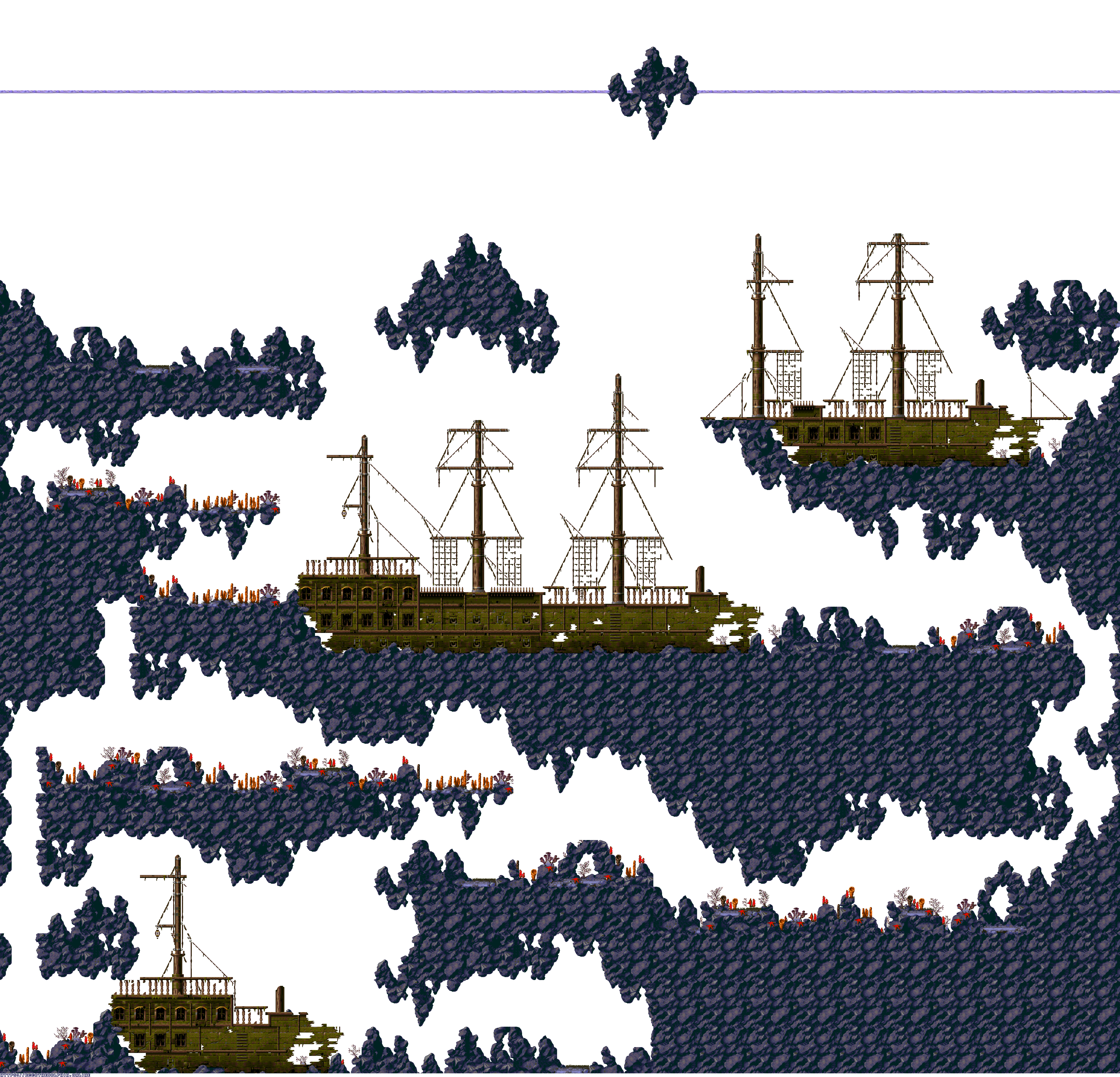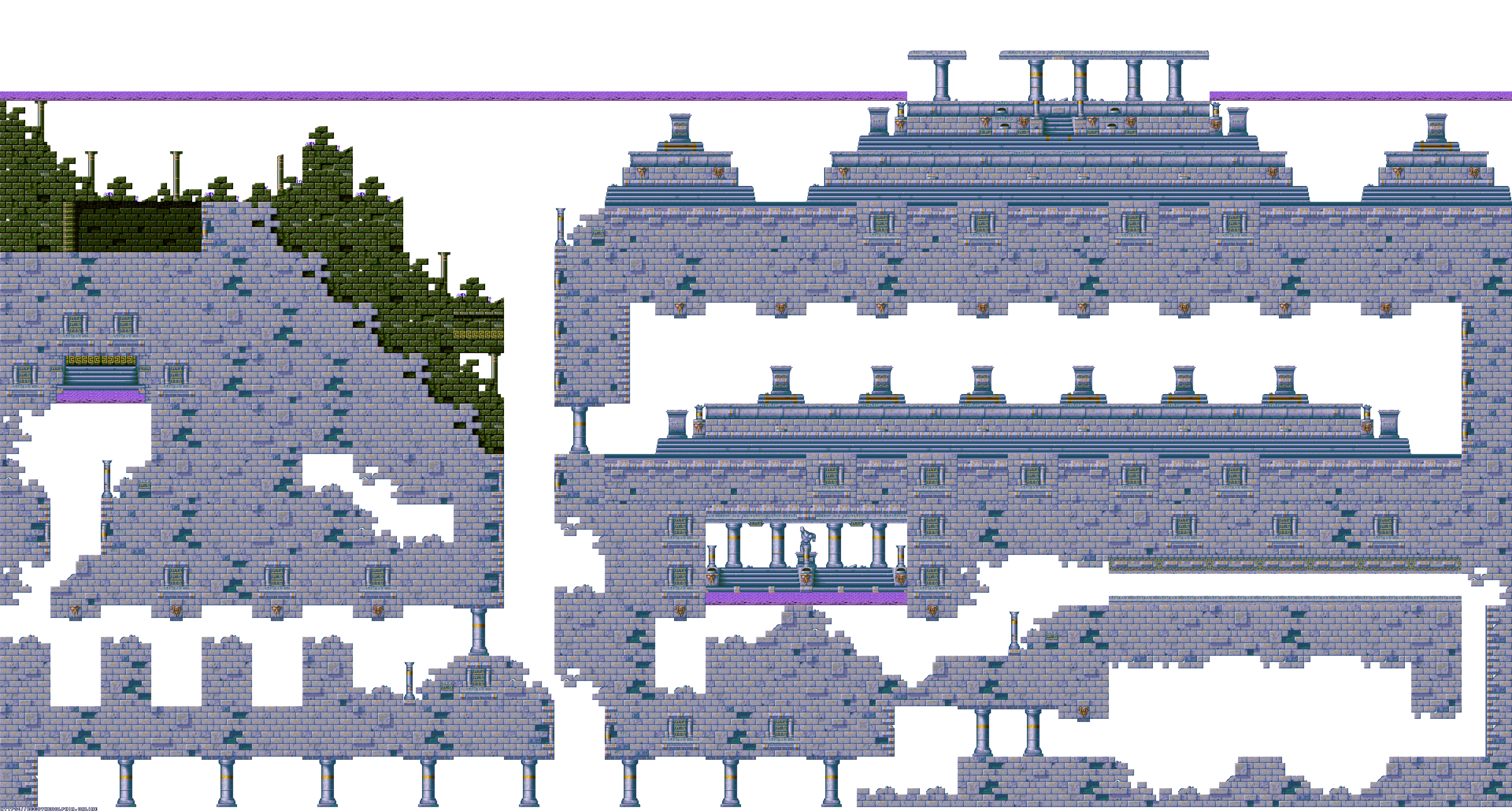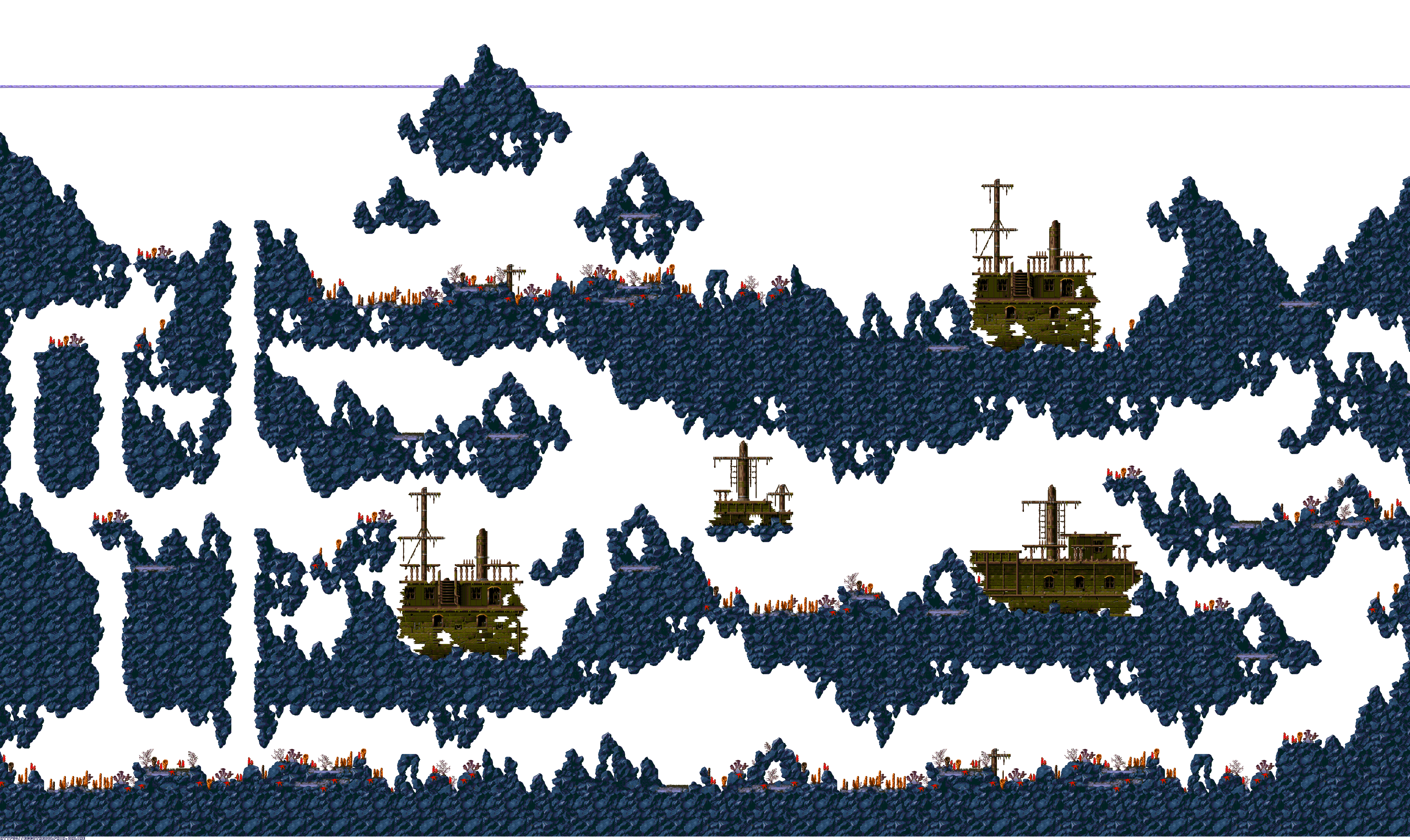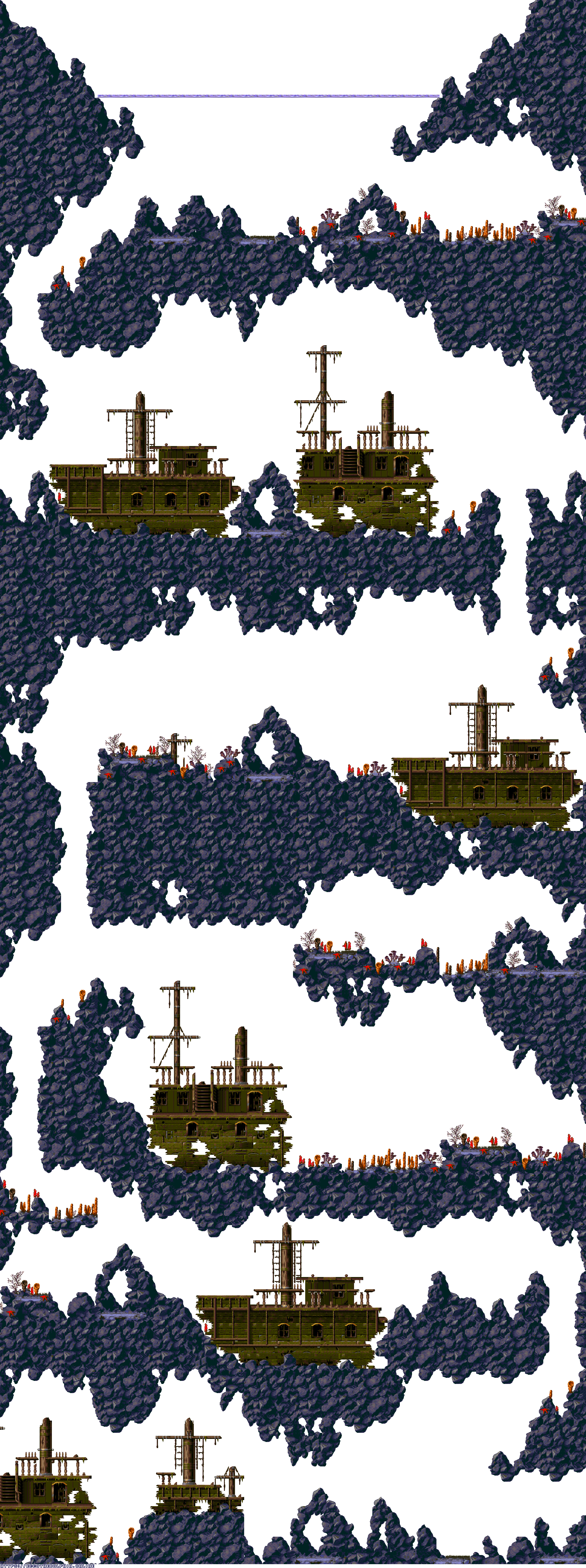 A collection of level maps from Ecco the Dolphin PC. This version of the game is unique for its high resolution mode. For that mode the overall graphics were doubled in size and partially redrawn. There is no parallax effect for backgrounds while in high resolution mode. Instead newer backgrounds were created to fit the size of the stage.