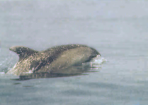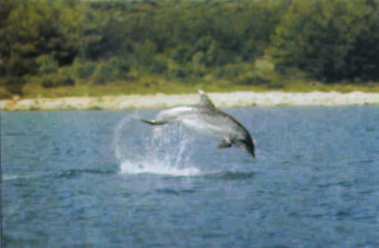 Concerning our dear friend Ecco, he is well known by the inhabitants of the islands of Cherso and Lussino in the Adriatic. He is often seen making a fool of himself, performing double jumps in the air. Ecco can be spotted by his unique dorsal fin that has a whice crescent of grey blue, the usual color for a dolphin. Ecco is a loner and likes to go from group to group.