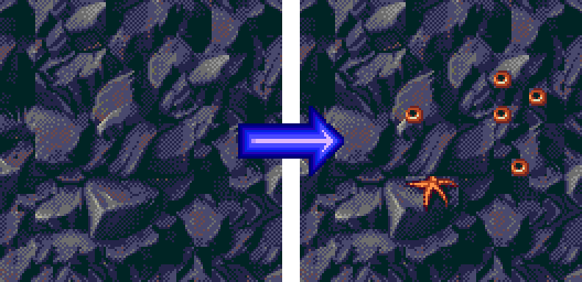When level data is read, a tile or metatile is loaded with information on if it should be flipped. There are three different ways to flip a metatile; horizontal, vertical, or both! In Ecco 2: The Tides of Time, metatiles can be customized by combining them with other metatiles to create new metatiles! Metatiles are usually combined to add small details to rocks like coral and plant life. In some situations they are combined to add mechanical details to machinery like those found in the Vortex worlds.