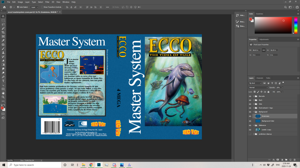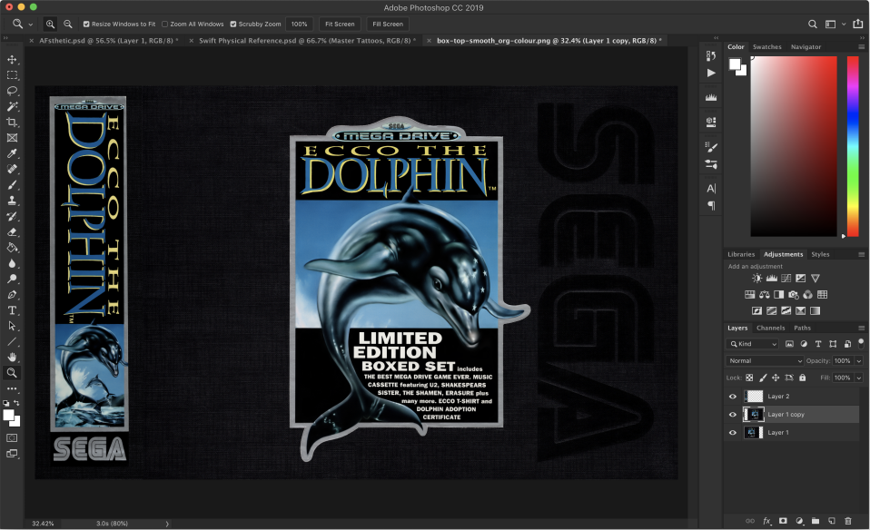 One of our most impressive restorations was performed on the box from the Ecco the Dolphin Boxed Set. The box had to be scanned in sections then pieced together matching its unique texture. We felt restoring the box digitally was important as it needed to be showcased due to it’s rarity. The boxed set is considered a holy grail item to both Ecco the Dolphin and Sega collectors.