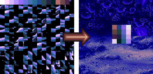 The tiles for the dolphin sprite from Ecco 2 are placed in a special order so they can be reassembled when they are loaded. In the above example the dolphin's tiles are replaced with solid colors to expose the overall ordering used for sprites.