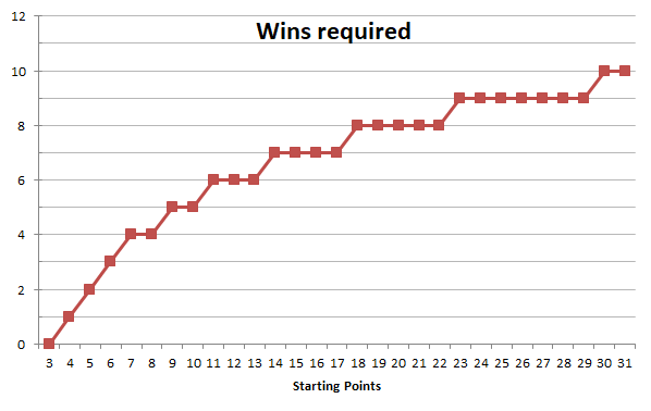 Losing stages follows a more complicated algorithm with a few hand-picked conditions to allow for fair penalties as well as making sure your points do not go beyond 31. For sake of simplicity we’re going to take a case where we are currently at 3 points and lose several stages in a row: