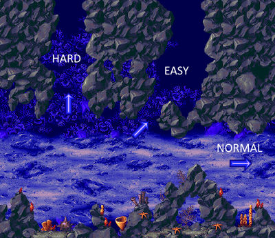 Current difficulty level can be immediately judged by the size of Ecco's life and air meters: as soon as you see that they've become somewhat squashed, the game is now in Hard mode! When this is active, not only you will face additional levels, but some of the existing ones will either have extra enemies or additional puzzles to stop you!